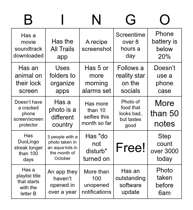 This bingo card has 25 words: 3 people with a photo taken in an aqua-tots in the month of October, More than 100 unopened notifications, Has 5 or more morning alarms set, Has a playlist title that starts with the letter B, Phone battery is below 20%, Has a movie soundtrack downloaded, Has an animal on their lock screen, Has the All Trails app, Photo of food that looks bad, but tastes good, Has "do not disturb" turned on, Follows a reality star on the socials, Doesn’t have a cracked phone screen/screen protector, Free!, Step count over 3000 today, Uses folders to organize apps, Photo taken before 6am, More than 50 notes, A recipe screenshot, Doesn’t use a phone case, Has a photo is a different country, Has more than 10 selfies this month so far, An app they haven’t opened in over a year, Has DuoLingo streak longer than 100 days, Screentime over 8 hours a day and Has an outstanding software update.