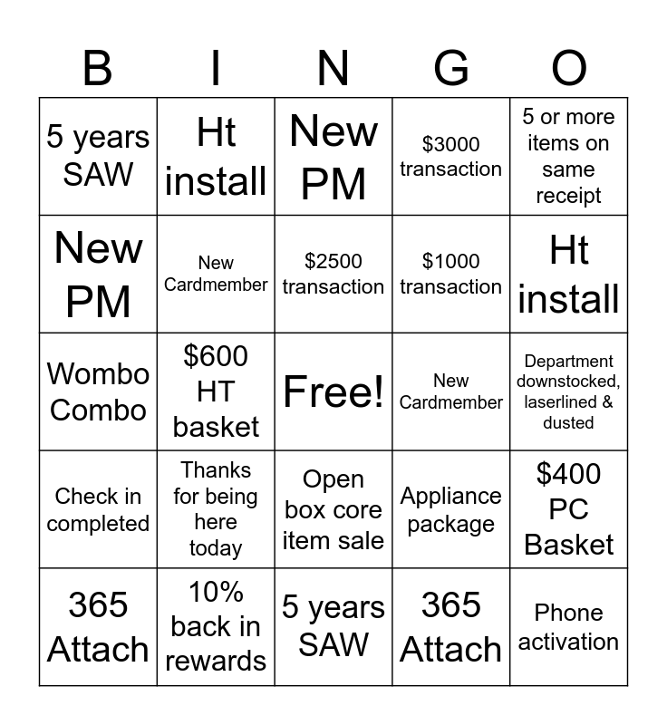 This bingo card has a free space and 24 words: Thanks for being here today, 10% back in rewards, $2500 transaction, 365 Attach, 5 or more items on same receipt, 5 years SAW, New PM, Ht install, New Cardmember, Open box core item sale, $1000 transaction, Wombo Combo, Appliance package, $400 PC Basket, New Cardmember, 365 Attach, Department downstocked, laserlined & dusted, New PM, Ht install, $600 HT basket, Phone activation, Check in completed, $3000 transaction and 5 years SAW.