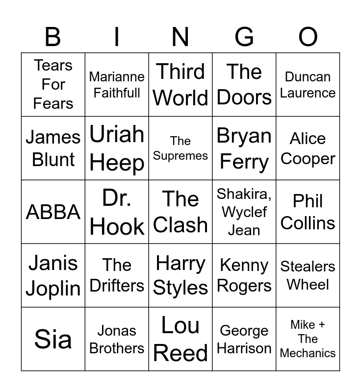 This bingo card has 25 words: The Drifters, Lou Reed, The Supremes, Sia, Duncan Laurence, Tears For Fears, James Blunt, Marianne Faithfull, Shakira, Wyclef Jean, Harry Styles, Bryan Ferry, ABBA, Kenny Rogers, Stealers Wheel, Uriah Heep, Mike + The Mechanics, Phil Collins, Third World, Alice Cooper, Dr. Hook, The Clash, Jonas Brothers, Janis Joplin, The Doors and George Harrison.