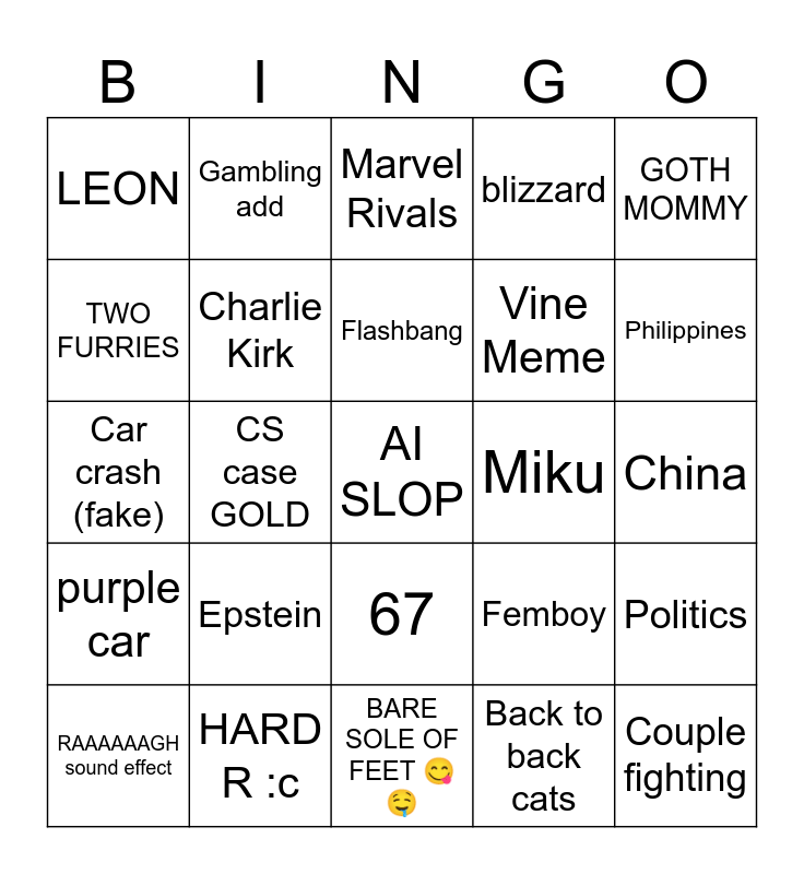 This bingo card has a free space and 24 words: Epstein, HARD R :c, Flashbang, RAAAAAAGH sound effect, GOTH MOMMY, LEON, TWO FURRIES, Gambling add, Miku, 67, Vine Meme, Car crash (fake), Femboy, Politics, Charlie Kirk, Back to back cats, China, Marvel Rivals, Philippines, CS case GOLD, Couple fighting, purple car, blizzard and BARE SOLE OF FEET 😋🤤.