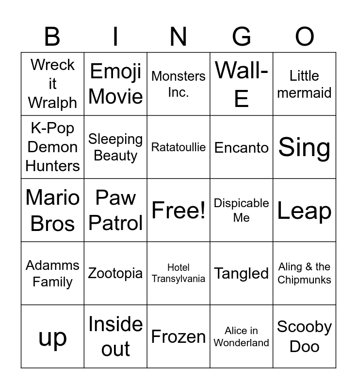 This bingo card has a free space and 24 words: Zootopia, Inside out, Ratatoullie, up, Little mermaid, Wreck it Wralph, K-Pop Demon Hunters, Emoji Movie, Dispicable Me, Hotel Transylvania, Encanto, Mario Bros, Tangled, Aling & the Chipmunks, Sleeping Beauty, Alice in Wonderland, Leap, Monsters Inc., Sing, Paw Patrol, Scooby Doo, Adamms Family, Wall-E and Frozen.