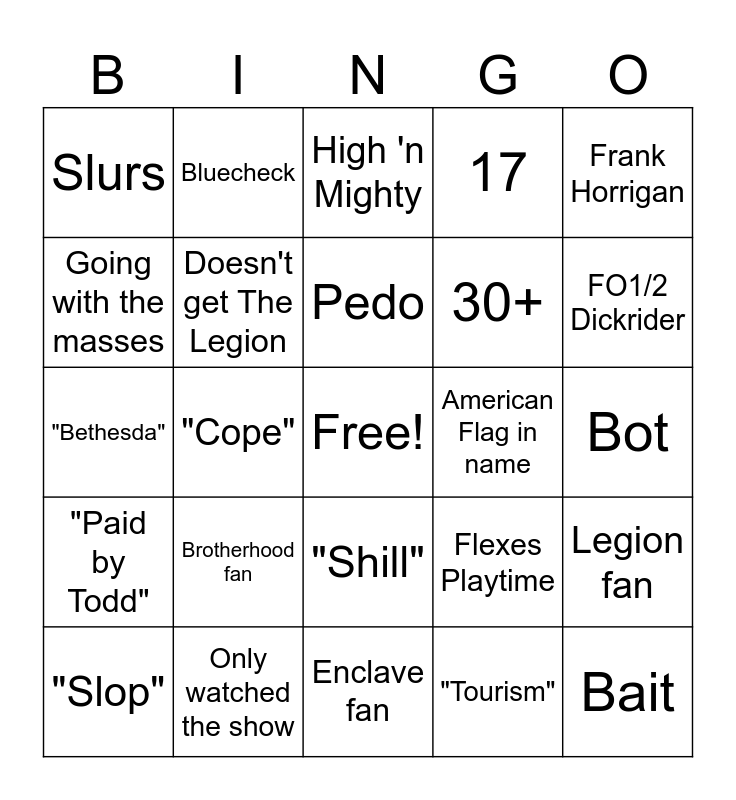 This bingo card has a free space and 24 words: Brotherhood fan, Only watched the show, Pedo, "Slop", Frank Horrigan, Slurs, Going with the masses, Bluecheck, American Flag in name, "Shill", 30+, "Bethesda", Flexes Playtime, Legion fan, Doesn't get The Legion, "Tourism", Bot, High 'n Mighty, FO1/2 Dickrider, "Cope", Bait, "Paid by Todd", 17 and Enclave fan.
