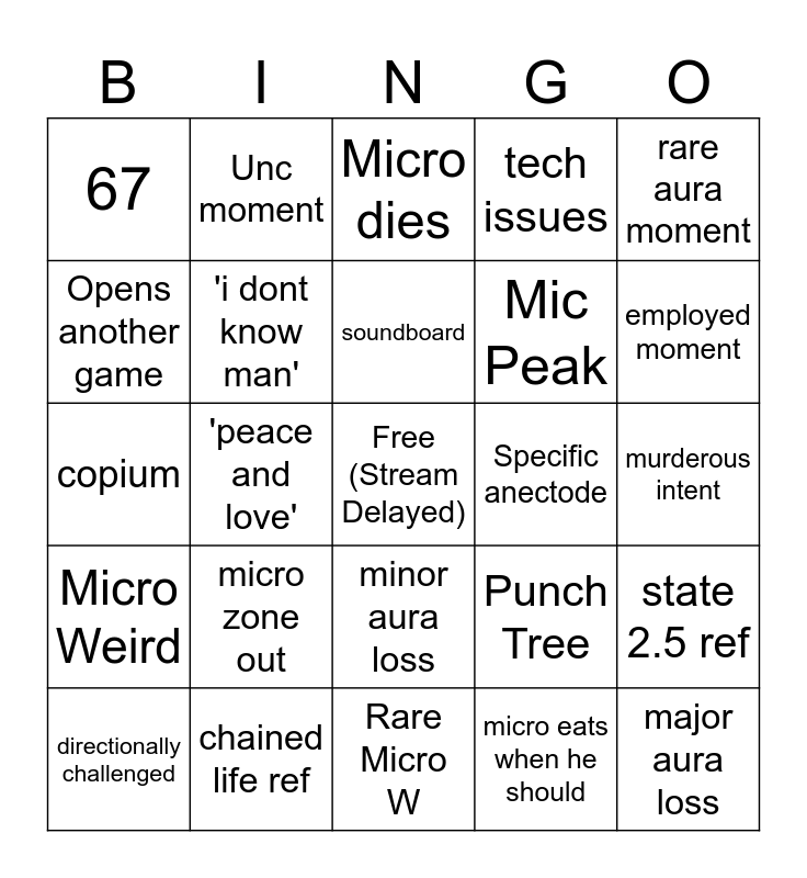 This bingo card has a free space and 27 words: Punch Tree, UI Stream, Mic Peak, Rare Micro W, Opens another game, Micro dies, Unc moment, Micro Weird, Specific anectode, state 2.5 ref, copium, tech issues, directionally challenged, chained life ref, employed moment, 'canada', 'i dont know man', soundboard, micro zone out, 67, murderous intent, micro eats when he should, 'peace and love', major aura loss, minor aura loss, rare aura moment and someone else mentions drugs.