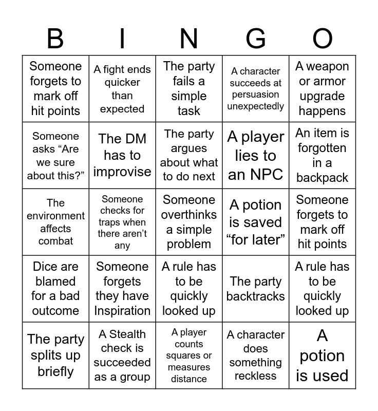 This bingo card has 151 words: Free!, A natural 20 is rolled, A natural 1 is rolled, A character drops to 0 hit points, The party argues about what to do next, A plan immediately goes wrong, Someone forgets an NPC’s name, A player speaks in character unexpectedly, A fight starts unexpectedly, A fight ends quicker than expected, Someone rolls for something unnecessary, The party splits up briefly, A player lies to an NPC, A player accidentally insults an NPC, The DM has to improvise, Someone asks “Are we sure about this?”, A hidden door or passage is found, The party triggers a trap, A Perception check is failed, A Stealth check is succeeded as a group, Someone scouts ahead alone, The party takes a short rest, The party takes a long rest, Gold is found, Loot causes a small argument, A magic item is found, A potion is used, A potion is saved “for later”, Someone forgets an ability they have, A spell completely misses, A spell solves a problem in an unexpected way, A skill check barely succeeds, A skill check barely fails, Someone rolls with advantage, Someone rolls with disadvantage, An enemy escapes, An enemy surrenders, A player uses the Help action, Someone overthinks a simple problem, An item is used creatively, The environment affects combat, A familiar or companion does something useful, A weapon or armor upgrade happens, Someone asks what an item is worth, An item is forgotten in a backpack, The party fails a simple task, The party succeeds despite bad odds, Someone says “I have an idea…”, Dice are blamed for a bad outcome, Table laughter breaks out, The session goes completely off the rails, Someone forgets to mark off hit points, A rule has to be quickly looked up, A player asks what dice to roll, Someone misreads a spell or ability, A character does something reckless, The party follows the wrong lead, An NPC gives vague or unhelpful information, The party makes things harder than necessary, A door becomes a problem, Someone checks for traps when there aren’t any, A character uses Inspiration, Someone forgets they have Inspiration, A perception check is rolled at the wrong time, A player says “Wait, never mind”, A character tries to intimidate someone unsuccessfully, A character succeeds at persuasion unexpectedly, A player asks if something is magical, The DM repeats a description, Someone forgets initiative order, A player counts squares or measures distance, The party backtracks, Someone asks how dark it is, A character interacts with something obviously dangerous, The party adopts or befriends a creature, Someone says “That’s not what I meant to do”, A natural 20 is rolled, A natural 1 is rolled, A character drops to 0 hit points, The party argues about what to do next, A plan immediately goes wrong, Someone forgets an NPC’s name, A player speaks in character unexpectedly, A fight starts unexpectedly, A fight ends quicker than expected, Someone rolls for something unnecessary, The party splits up briefly, A player lies to an NPC, A player accidentally insults an NPC, The DM has to improvise, Someone asks “Are we sure about this?”, A hidden door or passage is found, The party triggers a trap, A Perception check is failed, A Stealth check is succeeded as a group, Someone scouts ahead alone, The party takes a short rest, The party takes a long rest, Gold is found, Loot causes a small argument, A magic item is found, A potion is used, A potion is saved “for later”, Someone forgets an ability they have, A spell completely misses, A spell solves a problem in an unexpected way, A skill check barely succeeds, A skill check barely fails, Someone rolls with advantage, Someone rolls with disadvantage, An enemy escapes, An enemy surrenders, A player uses the Help action, Someone overthinks a simple problem, An item is used creatively, The environment affects combat, A familiar or companion does something useful, A weapon or armor upgrade happens, Someone asks what an item is worth, An item is forgotten in a backpack, The party fails a simple task, The party succeeds despite bad odds, Someone says “I have an idea…”, Dice are blamed for a bad outcome, Table laughter breaks out, The session goes completely off the rails, Someone forgets to mark off hit points, A rule has to be quickly looked up, A player asks what dice to roll, Someone misreads a spell or ability, A character does something reckless, The party follows the wrong lead, An NPC gives vague or unhelpful information, The party makes things harder than necessary, A door becomes a problem, Someone checks for traps when there aren’t any, A character uses Inspiration, Someone forgets they have Inspiration, A perception check is rolled at the wrong time, A player says “Wait, never mind”, A character tries to intimidate someone unsuccessfully, A character succeeds at persuasion unexpectedly, A player asks if something is magical, The DM repeats a description, Someone forgets initiative order, A player counts squares or measures distance, The party backtracks, Someone asks how dark it is, A character interacts with something obviously dangerous, The party adopts or befriends a creature and Someone says “That’s not what I meant to do”.