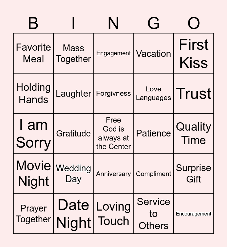 This bingo card has a free space and 24 words: Wedding Day, Date Night, Forgivness, Prayer Together, First Kiss, Favorite Meal, Holding Hands, Mass Together, Patience, Anniversary, Love Languages, I am Sorry, Compliment, Surprise Gift, Laughter, Service to Others, Quality Time, Engagement, Trust, Gratitude, Encouragement, Movie Night, Vacation and Loving Touch.