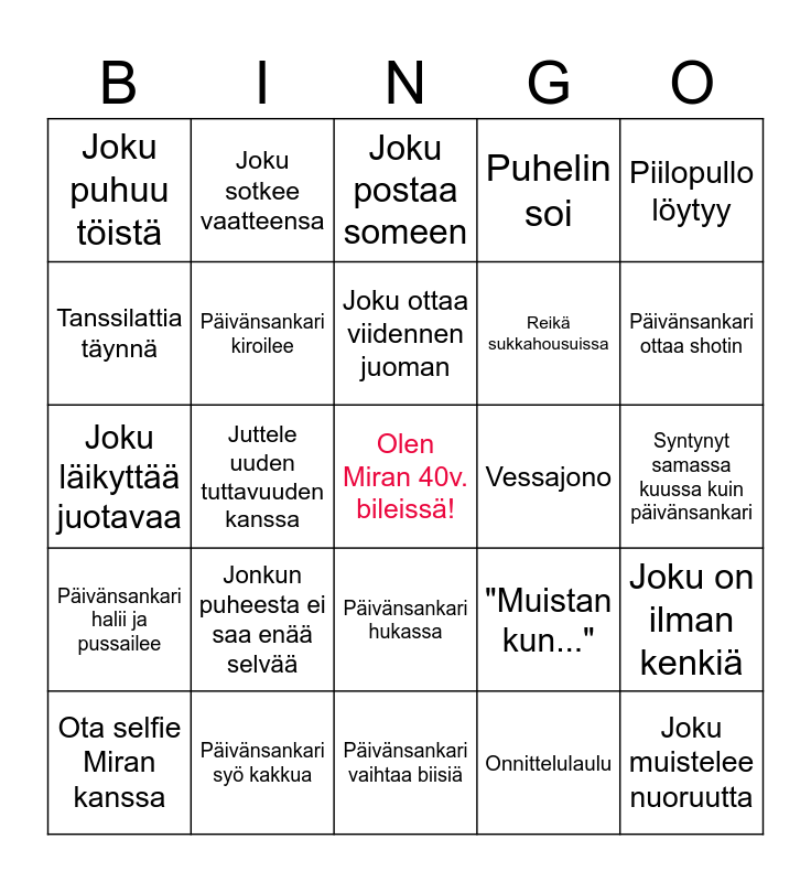 This bingo card has a free space and 24 words: Jonkun puheesta ei saa enää selvää, Päivänsankari syö kakkua, Joku ottaa viidennen juoman, Ota selfie Miran kanssa, Piilopullo löytyy, Joku puhuu töistä, Tanssilattia täynnä, Joku sotkee vaatteensa, Vessajono, Päivänsankari hukassa, Reikä sukkahousuissa, Joku läikyttää juotavaa, "Muistan kun...", Joku on ilman kenkiä, Päivänsankari kiroilee, Onnittelulaulu, Syntynyt samassa kuussa kuin päivänsankari, Joku postaa someen, Päivänsankari ottaa shotin, Juttele uuden tuttavuuden kanssa, Joku muistelee nuoruutta, Päivänsankari halii ja pussailee, Puhelin soi and Päivänsankari vaihtaa biisiä.