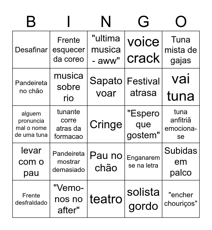 This bingo card has a free space and 24 words: Pandeireta mostrar demasiado, "Vemo-nos no after", Sapato voar, Frente desfraldado, Tuna mista de gajas, Desafinar, Pandeireta no chão, Frente esquecer da coreo, "Espero que gostem", Pau no chão, Festival atrasa, alguem pronuncia mal o nome de uma tuna, Enganarem se na letra, Subidas em palco, musica sobre rio, solista gordo, tuna anfitriã emociona-se, "ultima musica - aww", vai tuna, tunante corre atras da formacao, "encher chouriços", levar com o pau, voice crack and teatro.