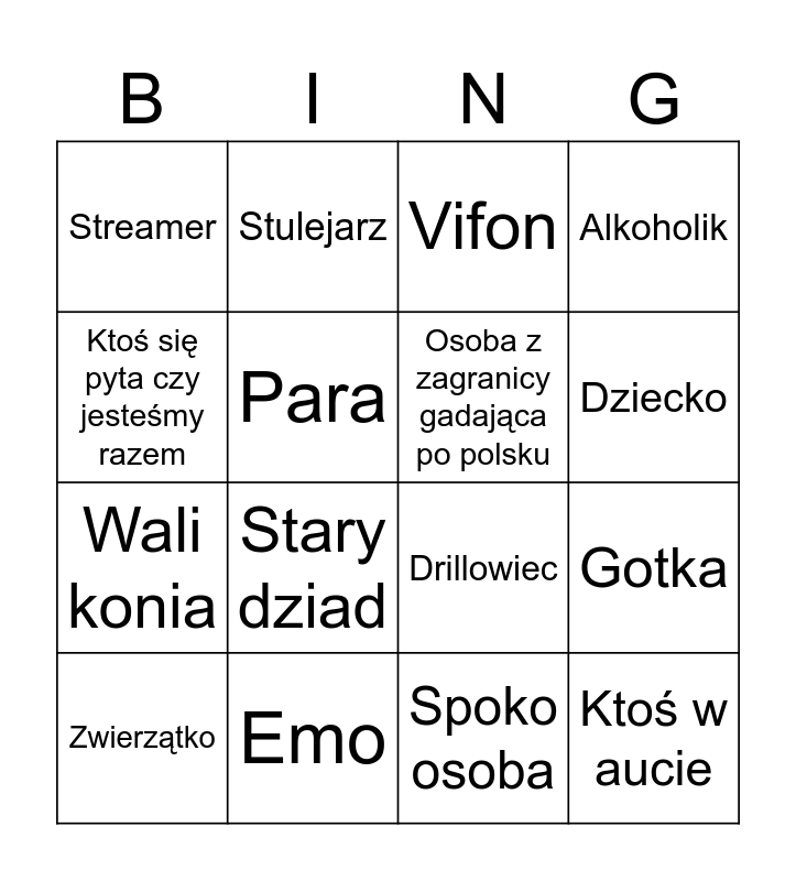 This bingo card has 16 words: Emo, Gotka, Vifon, Streamer, Wali konia, Stulejarz, Drillowiec, Spoko osoba, Ktoś się pyta czy jesteśmy razem, Para, Zwierzątko, Alkoholik, Stary dziad, Dziecko, Osoba z zagranicy gadająca po polsku and Ktoś w aucie.