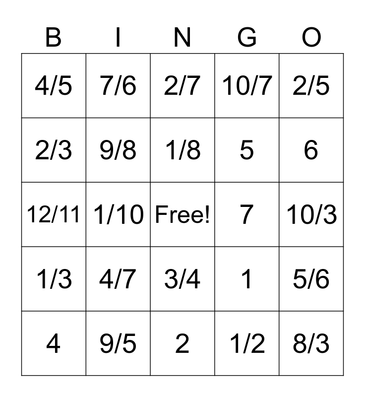 This bingo card has a free space and 29 words: 4, 7/10, 1/10, 3/5, 4/5, 2/7, 9/8, 4/7, 7, 9/5, 10/3, 8/3, 2, 1/2, 6, 11/10, 3/4, 1/3, 2/5, 12/11, 1, 3, 5, 2/3, 10/7, 7/6, 5/6, 1/8 and 2/9.