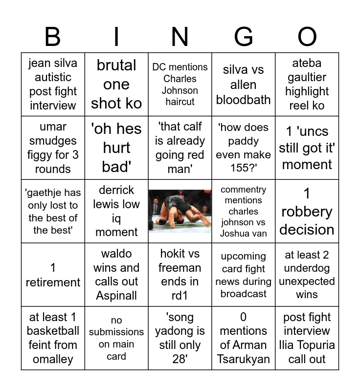 This bingo card has a free space and 24 words: waldo wins and calls out Aspinall, no submissions on main card, 'that calf is already going red man', at least 1 basketball feint from omalley, ateba gaultier highlight reel ko, jean silva autistic post fight interview, umar smudges figgy for 3 rounds, brutal one shot ko, commentry mentions charles johnson vs Joshua van, hokit vs freeman ends in rd1, 'how does paddy even make 155?', 'gaethje has only lost to the best of the best', upcoming card fight news during broadcast, at least 2 underdog unexpected wins, 'oh hes hurt bad', 0 mentions of Arman Tsarukyan, 1 robbery decision, DC mentions Charles Johnson haircut, 1 'uncs still got it' moment, derrick lewis low iq moment, post fight interview Ilia Topuria call out, 1 retirement, silva vs allen bloodbath and 'song yadong is still only 28'.