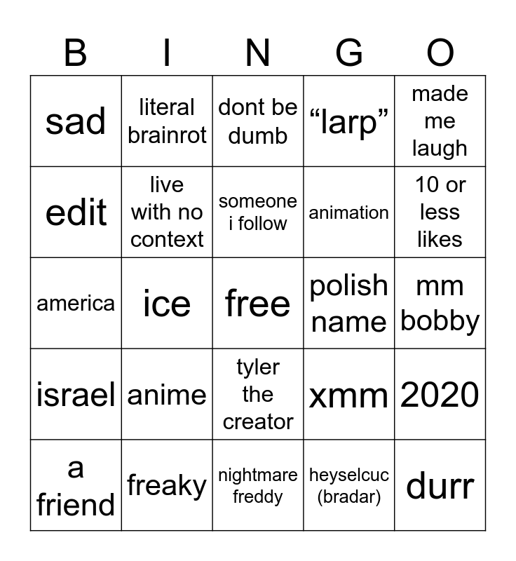 This bingo card has a free space and 24 words: anime, freaky, someone i follow, a friend, made me laugh, sad, edit, literal brainrot, polish name, tyler the creator, animation, america, xmm, 2020, live with no context, heyselcuc (bradar), mm bobby, dont be dumb, 10 or less likes, ice, durr, israel, “larp” and nightmare freddy.