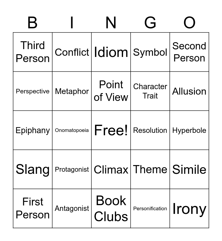 This bingo card has a free space and 24 words: Protagonist, Antagonist, Point of View, First Person, Second Person, Third Person, Perspective, Conflict, Resolution, Climax, Character Trait, Epiphany, Theme, Simile, Metaphor, Personification, Hyperbole, Idiom, Allusion, Onomatopoeia, Irony, Slang, Symbol and Book Clubs.