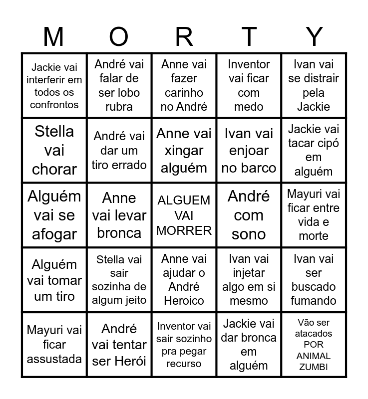 This bingo card has a free space and 24 words: Stella vai sair sozinha de algum jeito, André vai tentar ser Herói, Anne vai xingar alguém, Mayuri vai ficar assustada, Ivan vai se distrair pela Jackie, Jackie vai interferir em todos os confrontos, Stella vai chorar, André vai falar de ser lobo rubra, André com sono, Anne vai ajudar o André Heroico, Ivan vai enjoar no barco, Alguém vai se afogar, Ivan vai injetar algo em si mesmo, Ivan vai ser buscado fumando, André vai dar um tiro errado, Jackie vai dar bronca em alguém, Mayuri vai ficar entre vida e morte, Anne vai fazer carinho no André, Jackie vai tacar cipó em alguém, Anne vai levar bronca, Vão ser atacados POR ANIMAL ZUMBI, Alguém vai tomar um tiro, Inventor vai ficar com medo and Inventor vai sair sozinho pra pegar recurso.