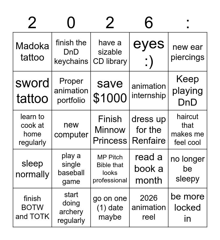 This bingo card has a free space and 24 words: play a single baseball game, start doing archery regularly, save $1000, finish BOTW and TOTK, new ear piercings, Madoka tattoo, sword tattoo, finish the DnD keychains, dress up for the Renfaire, MP Pitch Bible that looks professional, animation internship, learn to cook at home regularly, read a book a month, no longer be sleepy, Proper animation portfolio, 2026 animation reel, haircut that makes me feel cool, have a sizable CD library, Keep playing DnD, new computer, be more locked in, sleep normally, eyes :) and go on one (1) date maybe.