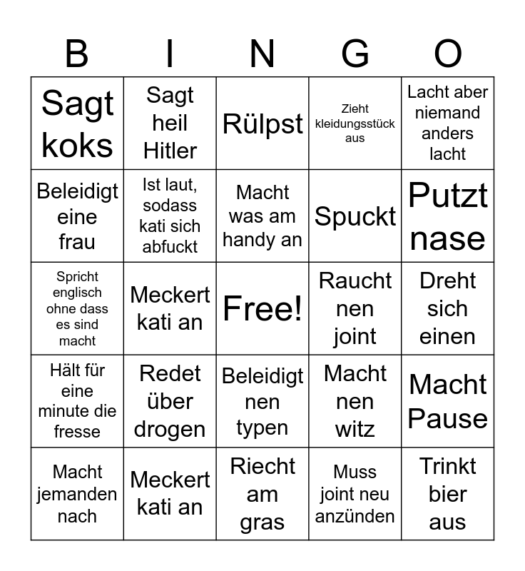 This bingo card has a free space and 24 words: Redet über drogen, Meckert kati an, Macht was am handy an, Macht jemanden nach, Lacht aber niemand anders lacht, Sagt koks, Beleidigt eine frau, Sagt heil Hitler, Raucht nen joint, Beleidigt nen typen, Spuckt, Spricht englisch ohne dass es sind macht, Macht nen witz, Macht Pause, Ist laut, sodass kati sich abfuckt, Muss joint neu anzünden, Dreht sich einen, Rülpst, Putzt nase, Meckert kati an, Trinkt bier aus, Hält für eine minute die fresse, Zieht kleidungsstück aus and Riecht am gras.