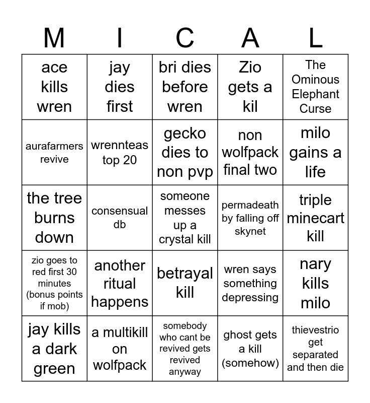 This bingo card has 25 words: another ritual happens, somebody who cant be revived gets revived anyway, gecko dies to non pvp, jay kills a dark green, The Ominous Elephant Curse, ace kills wren, aurafarmers revive, jay dies first, permadeath by falling off skynet, betrayal kill, non wolfpack final two, the tree burns down, wren says something depressing, nary kills milo, wrennteas top 20, thievestrio get separated and then die, triple minecart kill, bri dies before wren, milo gains a life, consensual db, someone messes up a crystal kill, a multikill on wolfpack, zio goes to red first 30 minutes (bonus points if mob), Zio gets a kil and ghost gets a kill (somehow).