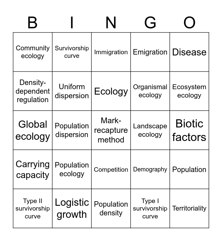 This bingo card has 30 words: Logistic growth, Abiotic factors, Population dispersion, Type III survivorship curve, Community ecology, Immigration, Uniform dispersion, Competition, Landscape ecology, Population density, Biotic factors, Mark-recapture method, Type I survivorship curve, Territoriality, Ecosystem ecology, Random dispersion, Demography, Carrying capacity, Population ecology, Disease, Global ecology, Clumped dispersion, Survivorship curve, Organismal ecology, Density-dependent regulation, Emigration, Population, Type II survivorship curve, Ecology and Exponential growth.