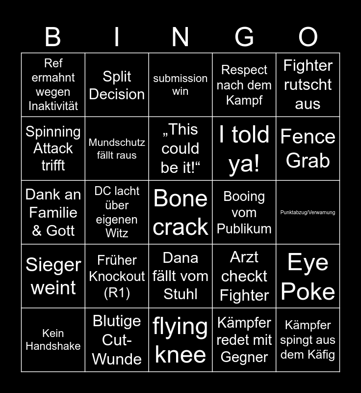 This bingo card has a free space and 24 words: Früher Knockout (R1), Blutige Cut-Wunde, „This could be it!“, Kein Handshake, Fighter rutscht aus, Ref ermahnt wegen Inaktivität, Spinning Attack trifft, Split Decision, Booing vom Publikum, Dana fällt vom Stuhl, I told ya!, Dank an Familie & Gott, Arzt checkt Fighter, Eye Poke, Mundschutz fällt raus, Kämpfer redet mit Gegner, Punktabzug/Verwarnung, submission win, Fence Grab, DC lacht über eigenen Witz, Kämpfer spingt aus dem Käfig, Sieger weint, Respect nach dem Kampf and flying knee.