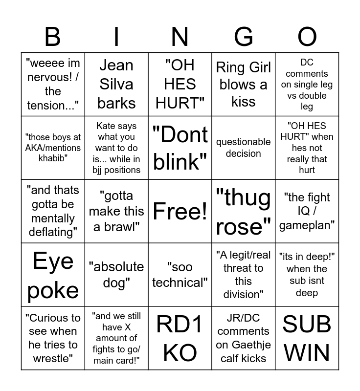 This bingo card has a free space and 24 words: "Curious to see when he tries to wrestle", "absolute dog", "Dont blink", JR/DC comments on Gaethje calf kicks, DC comments on single leg vs double leg, "weeee im nervous! / the tension...", Jean Silva barks, "OH HES HURT", "thug rose", "the fight IQ / gameplan", "and thats gotta be mentally deflating", Kate says what you want to do is... while in bjj positions, "A legit/real threat to this division", "its in deep!" when the sub isnt deep, "those boys at AKA/mentions khabib", "and we still have X amount of fights to go/ main card!", RD1 KO, Ring Girl blows a kiss, "OH HES HURT" when hes not really that hurt, Eye poke, "gotta make this a brawl", "soo technical", questionable decision and SUB WIN.