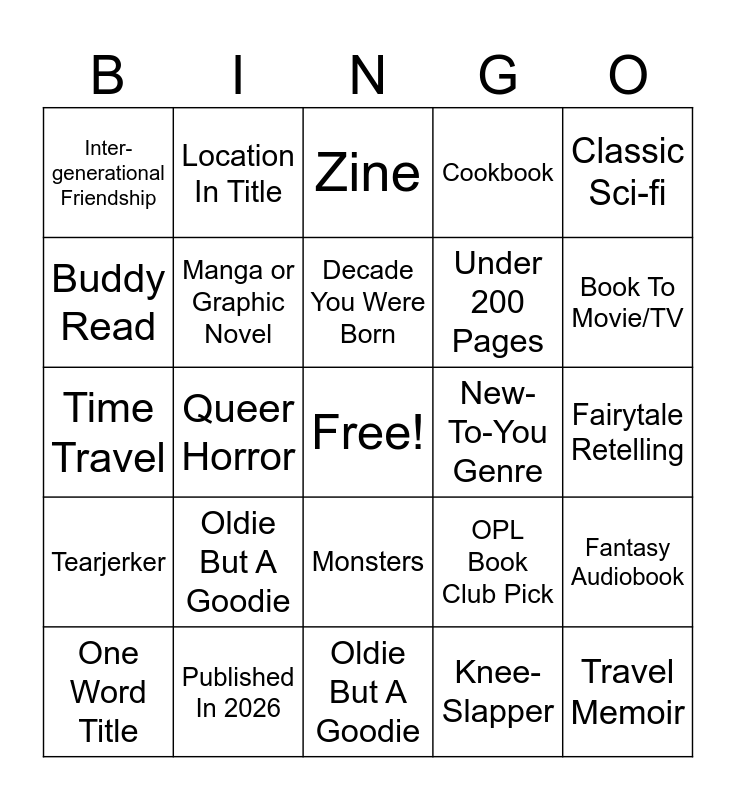 This bingo card has a free space and 25 words: Oldie But A Goodie, Oldie But A Goodie, Decade You Were Born, One Word Title, Classic Sci-fi, Inter-generational Friendship, Buddy Read, Location In Title, New-To-You Genre, Monsters, Under 200 Pages, Time Travel, OPL Book Club Pick, Fantasy Audiobook, Manga or Graphic Novel, African-Born Author, Fairytale Retelling, Zine, Book To Movie/TV, Queer Horror, Travel Memoir, Published In 2026, Tearjerker, Cookbook and Knee-Slapper.