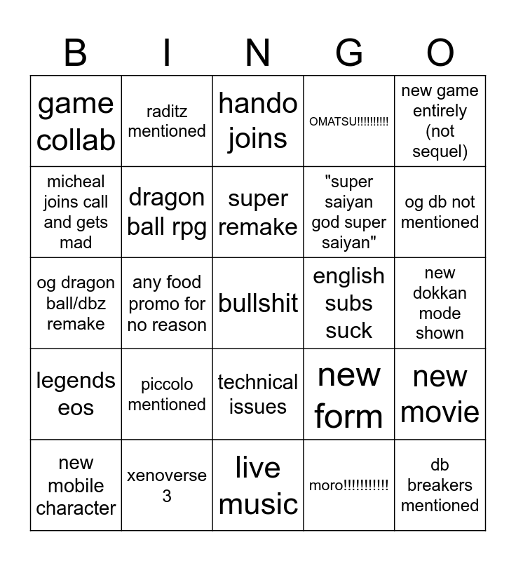 This bingo card has a free space and 24 words: piccolo mentioned, xenoverse 3, super remake, new mobile character, new game entirely (not sequel), game collab, micheal joins call and gets mad, raditz mentioned, english subs suck, technical issues, "super saiyan god super saiyan", og dragon ball/dbz remake, new form, new movie, dragon ball rpg, moro!!!!!!!!!!!, new dokkan mode shown, hando joins, og db not mentioned, any food promo for no reason, db breakers mentioned, legends eos, OMATSU!!!!!!!!!! and live music.