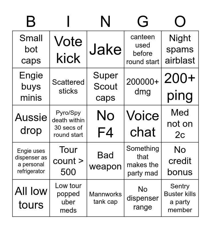 This bingo card has 25 words: Tour count > 500, Mannworks tank cap, Super Scout caps, All low tours, Night spams airblast, Small bot caps, Engie buys minis, Vote kick, Voice chat, Bad weapon, 200000+ dmg, Aussie drop, Something that makes the party mad, No credit bonus, Scattered sticks, Sentry Buster kills a party member, Med not on 2c, Jake, 200+ ping, Pyro/Spy death within 30 secs of round start, No F4, Low tour popped uber meds, Engie uses dispenser as a personal refrigerator, canteen used before round start and No dispenser range.