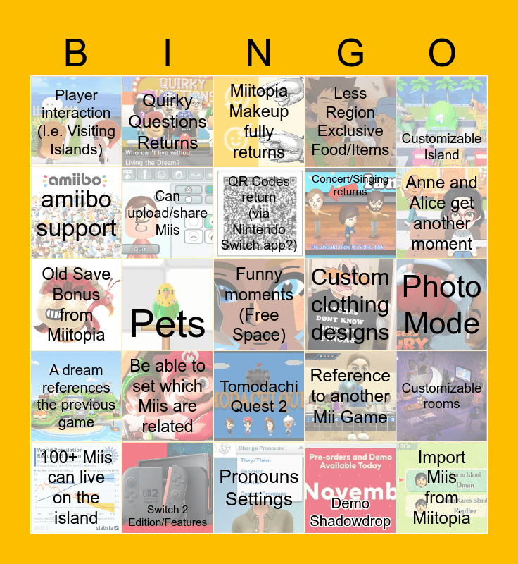 This bingo card has 30 images, a free space and 30 words: GAY PEOPLE, Switch 2 Edition/Features, Miitopia Makeup fully returns, Accents (Ex. British accents in USA copies & vice versa), Customizable Island, Player interaction (I.e. Visiting Islands), Can upload/share Miis, QR Codes return (via Nintendo Switch app?), Concert/Singing returns, Import Miis from Miitopia, 100+ Miis can live on the island, Be able to set which Miis are related, Demo Shadowdrop, Choose who Miis are attracted to, A dream references the previous game, Gender-swap item, Pronouns Settings, Custom clothing designs, Customizable rooms, amiibo support, Pets, Easier to prevent breakups/divorce, Less Region Exclusive Food/Items, Photo Mode, Old Save Bonus from Miitopia, Quirky Questions Returns, Tomodachi Quest 2, Reference to another Mii Game, Anne and Alice get another moment and Miitomo Expressions.