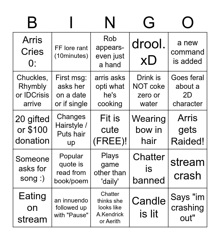 This bingo card has a free space and 29 words: Eating on stream, Daily is played (include naruto.dle), Changes Hairstyle / Puts hair up, OOTD fit check, Arris Cries 0:, Rob appears-even just a hand, First msg: asks her on a date or if single, Popular quote is read from book/poem, Wearing bow in hair, an innuendo followed up with "Pause", Arris gets Raided!, Says "im crashing out", Chatter thinks she looks like A.Kendrick or Aerith, Candle is lit, Goes feral about a 2D character, Outfit change, Plays game other than 'daily', Someone asks for song :), a new command is added, 20 gifted or $100 donation, Chatter is banned, stream reaches 3 hours, Drink is NOT coke zero or water, Chuckles, Rhymbly or IDCrisis arrive, drool. xD, FF lore rant (10minutes), stream crash, arris asks opti what he's cooking and sniff vinegar.