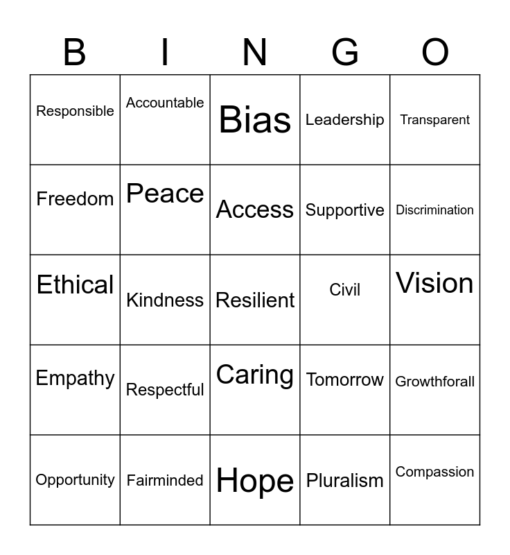 This bingo card has a free space and 24 words: Respectful, Fairminded, Access, Opportunity, Transparent, Responsible, Freedom, Accountable, Civil, Caring, Supportive, Ethical, Tomorrow, Growthforall, Peace, Pluralism, Vision, Bias, Discrimination, Kindness, Compassion, Empathy, Leadership and Hope.