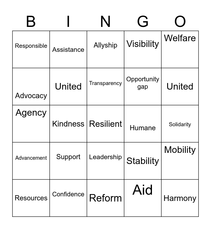This bingo card has a free space and 24 words: Support, Confidence, Transparency, Resources, Welfare, Responsible, Advocacy, Assistance, Humane, Leadership, Opportunity gap, Agency, Stability, Mobility, United, Aid, Solidarity, Allyship, United, Kindness, Harmony, Advancement, Visibility and Reform.