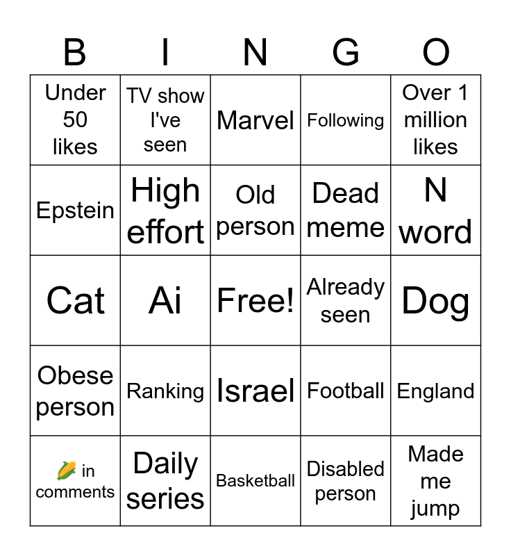 This bingo card has a free space and 24 words: 🌽 in comments, Ranking, Old person, Disabled person, Over 1 million likes, Under 50 likes, TV show I've seen, Marvel, Already seen, Dog, Cat, High effort, Football, England, Epstein, Daily series, Basketball, Following, N word, Obese person, Ai, Israel, Dead meme and Made me jump.