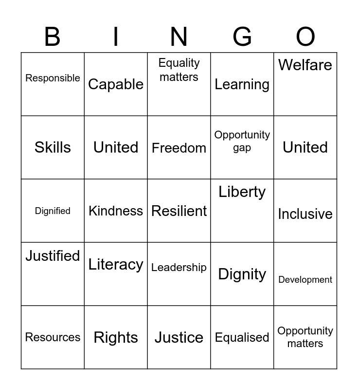 This bingo card has a free space and 24 words: Literacy, Rights, Freedom, Resources, Welfare, Responsible, Skills, Capable, Liberty, Leadership, Opportunity gap, Dignified, Dignity, Development, United, Equalised, Inclusive, Equality matters, United, Kindness, Opportunity matters, Justified, Learning and Justice.