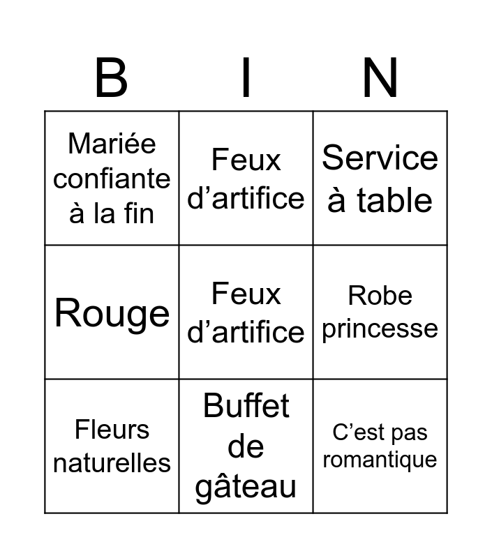 This bingo card has a free space and 8 words: Robe princesse, Service à table, Feux d’artifice, Fleurs naturelles, Mariée confiante à la fin, C’est pas romantique, Rouge and Buffet de gâteau.