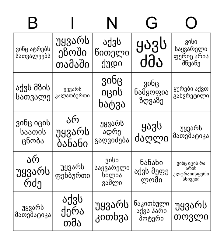 This bingo card has 25 words: უყვარს ფეხბურთი, უყვარს კითხვა, ვინც იცის ხატვა, უყვარს მათემატიკა, ვისი საყვარელი ფერიც არის მწვანე, ვინც ატრებს სათვალეებს, აქვს მზის სათვალე, უყვარს ეზოში თამაში, ყავს ძაღლი, ვისი საყვარელი ხილია ვაშლი, ვინც ნამყოფია ზღვაზე, ვინც იცის საათის ცნობა, ნანახი აქვს მეფე ლომი, ვინც იცის რა არის ულტრაიისფერი სხივები, უყვარს კალათბურთი, უყვარს თოვლი, უყვარს მათემატიკა, აქვს წითელი ქუდი, ყურები აქვთ გახვრეტილი, არ უყვარს ბანანი, უყვარს ადრე გაღვიძება, აქვს ქერა თმა, არ უყვარს რძე, ყავს ძმა and წაკითხული აქვს ჰარი პოტერი.
