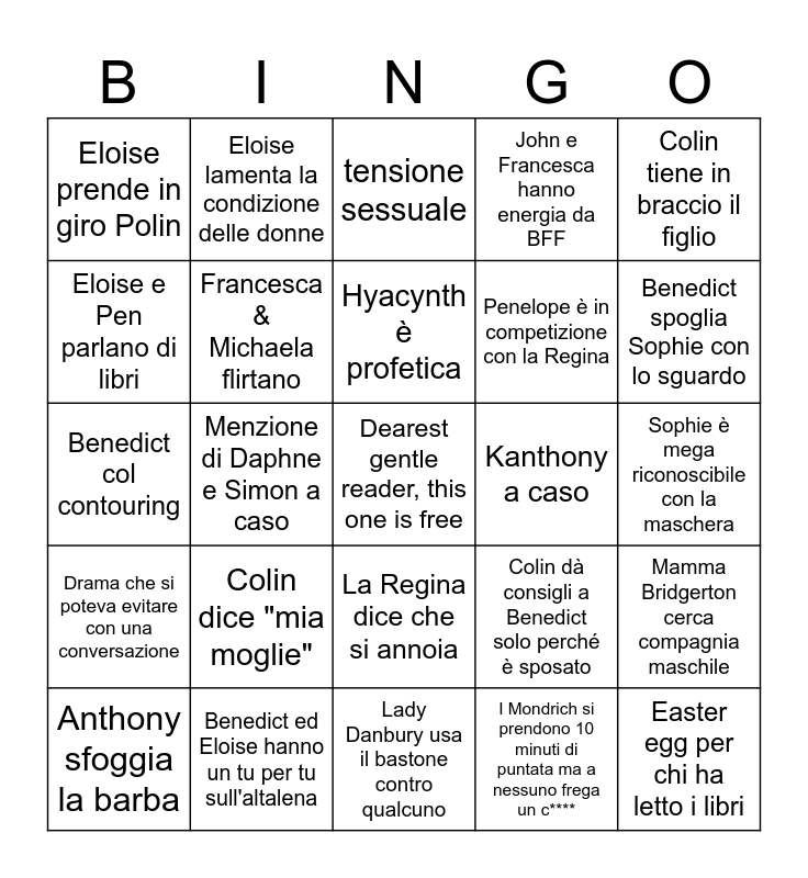 This bingo card has a free space and 24 words: Colin dice "mia moglie", Benedict ed Eloise hanno un tu per tu sull'altalena, Hyacynth è profetica, Anthony sfoggia la barba, Colin tiene in braccio il figlio, Eloise prende in giro Polin, Eloise e Pen parlano di libri, Eloise lamenta la condizione delle donne, Kanthony a caso, La Regina dice che si annoia, Penelope è in competizione con la Regina, Benedict col contouring, Colin dà consigli a Benedict solo perché è sposato, Mamma Bridgerton cerca compagnia maschile, Francesca & Michaela flirtano, I Mondrich si prendono 10 minuti di puntata ma a nessuno frega un c****, Sophie è mega riconoscibile con la maschera, tensione sessuale, Benedict spoglia Sophie con lo sguardo, Menzione di Daphne e Simon a caso, Easter egg per chi ha letto i libri, Drama che si poteva evitare con una conversazione, John e Francesca hanno energia da BFF and Lady Danbury usa il bastone contro qualcuno.
