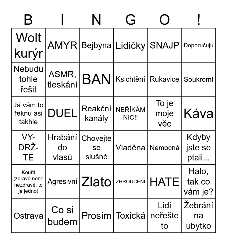This bingo card has 36 words: Ondy Plešula, Chlap Zlatooo, Toxická, Nebudu tohle řešit, VY-DRŽ-TE, NEŘÍKÁM NIC!!, ASMR, tleskání, Prosím, SNAJP, HATE, Soukromí, Lidičky, Halo, tak co vám je?, DUEL, Ksichtění, Wolt kurýr, Kouřit (zdravě nebo nezdravě, to je jedno), To je moje věc, Já vám to řeknu asi takhle, Bejbyna, Reakční kanály, Hrabání do vlasů, Vladěna, Chovejte se slušně, Nemocná, AMYR, Rukavice, Co si budem, BAN, Vy jste hnusnýýýýýý, Žebrání na ubytko, Ostrava, Kdyby jste se ptali..., Káva, Agresivní and Lidi neřešte to.