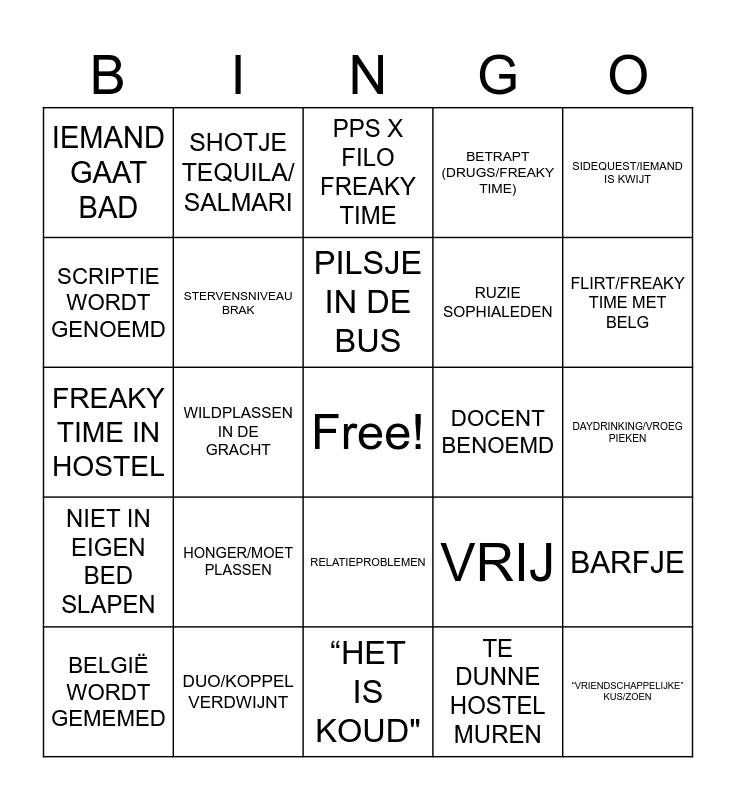 This bingo card has a free space and 25 words: HONGER/MOET PLASSEN, “HET IS KOUD", PILSJE IN DE BUS, BELGIË WORDT GEMEMED, SIDEQUEST/IEMAND IS KWIJT, IEMAND GAAT BAD, SCRIPTIE WORDT GENOEMD, SHOTJE TEQUILA/ SALMARI, DOCENT BENOEMD, RELATIEPROBLEMEN, RUZIE SOPHIALEDEN, FREAKY TIME IN HOSTEL, VRIJ, BARFJE, STERVENSNIVEAU BRAK, PPS VS. FILO, DAYDRINKING/VROEG PIEKEN, PPS X FILO FREAKY TIME, FLIRT/FREAKY TIME MET BELG, WILDPLASSEN IN DE GRACHT, “VRIENDSCHAPPELIJKE” KUS/ZOEN, DUO/KOPPEL VERDWIJNT, NIET IN EIGEN BED SLAPEN, BETRAPT (DRUGS/FREAKY TIME) and TE DUNNE HOSTEL MUREN.