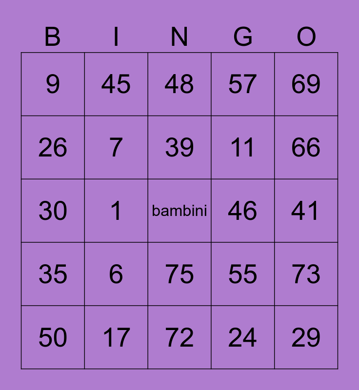 This bingo card has a free space and 24 words: 6, 17, 39, 50, 69, 9, 26, 45, 46, 75, 11, 30, 55, 73, 7, 24, 41, 48, 66, 1, 29, 35, 57 and 72.