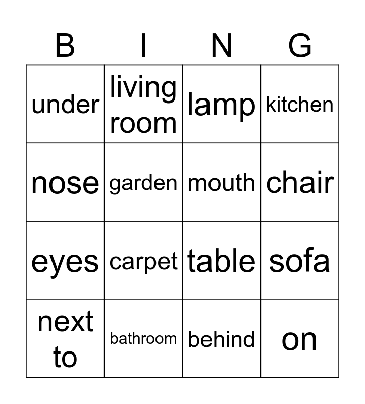 This bingo card has 16 words: bathroom, sofa, lamp, under, eyes, living room, table, behind, nose, garden, next to, kitchen, carpet, chair, mouth and on.