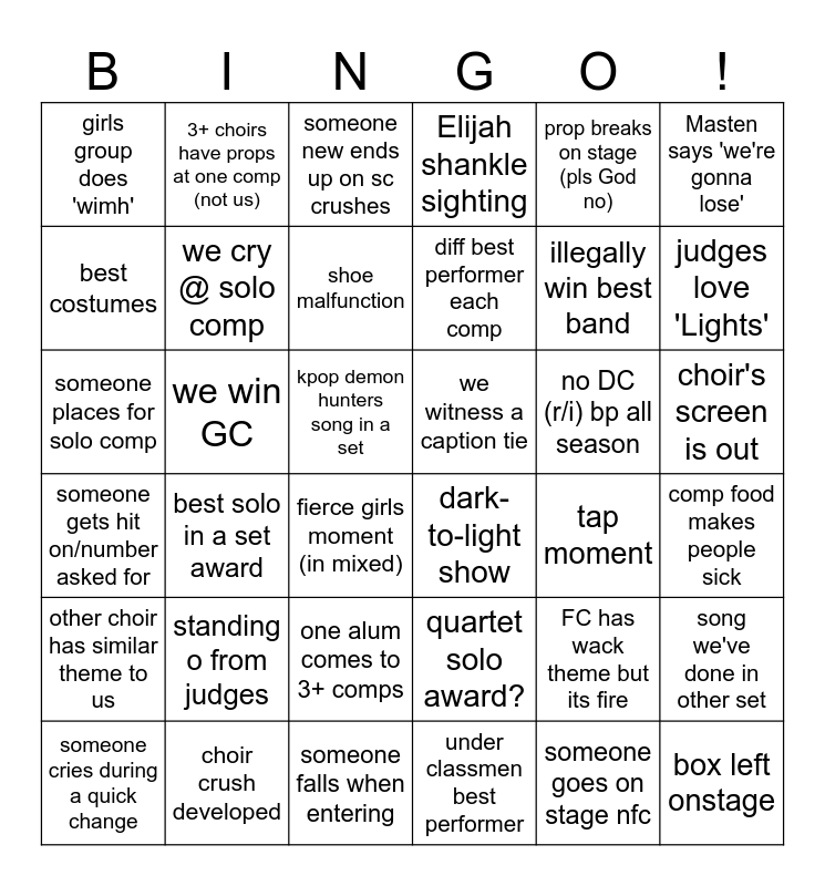 This bingo card has 36 words: quartet solo award?, one alum comes to 3+ comps, under classmen best performer, best costumes, someone gets hit on/number asked for, we witness a caption tie, we cry @ solo comp, someone falls when entering, prop breaks on stage (pls God no), FC has wack theme but its fire, judges love 'Lights', Elijah shankle sighting, song we've done in other set, we win GC, diff best performer each comp, girls group does 'wimh', other choir has similar theme to us, no DC (r/i) bp all season, someone places for solo comp, someone new ends up on sc crushes, kpop demon hunters song in a set, best solo in a set award, dark-to-light show, fierce girls moment (in mixed), tap moment, 3+ choirs have props at one comp (not us), illegally win best band, choir crush developed, shoe malfunction, Masten says 'we're gonna lose', box left onstage, someone cries during a quick change, comp food makes people sick, choir's screen is out, standing o from judges and someone goes on stage nfc.