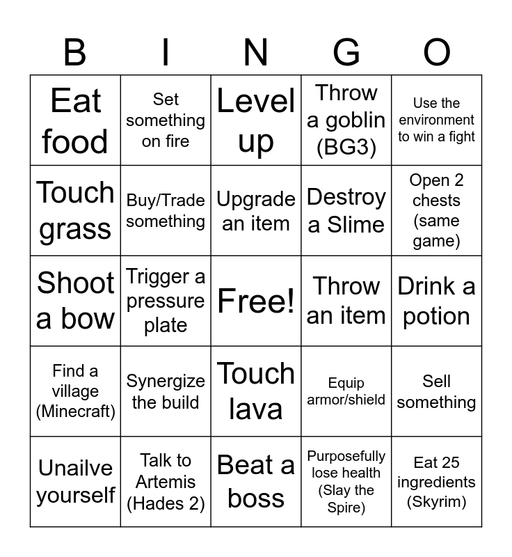 This bingo card has a free space and 25 words: Synergize the build, Beat a boss, Upgrade an item, Unailve yourself, Use the environment to win a fight, Eat food, Touch grass, Set something on fire, Throw an item, Touch lava, Destroy a Slime, Shoot a bow, Equip armor/shield, Sell something, Buy/Trade something, Destroy multiple enemies at once, Drink a potion, Level up, Open 2 chests (same game), Trigger a pressure plate, Eat 25 ingredients (Skyrim), Talk to Artemis (Hades 2), Find a village (Minecraft), Throw a goblin (BG3) and Purposefully lose health (Slay the Spire).