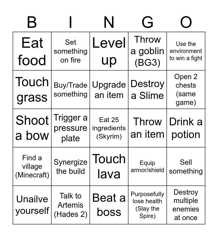 This bingo card has 25 words: Synergize the build, Beat a boss, Upgrade an item, Unailve yourself, Use the environment to win a fight, Eat food, Touch grass, Set something on fire, Throw an item, Touch lava, Destroy a Slime, Shoot a bow, Equip armor/shield, Sell something, Buy/Trade something, Destroy multiple enemies at once, Drink a potion, Level up, Open 2 chests (same game), Trigger a pressure plate, Eat 25 ingredients (Skyrim), Talk to Artemis (Hades 2), Find a village (Minecraft), Throw a goblin (BG3) and Purposefully lose health (Slay the Spire).