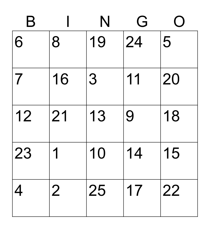 This bingo card has a free space and 24 words: 1, 2, 3, 4, 5, 6, 7, 8, 9, 10, 11, 12, 14, 15, 16, 17, 18, 19, 20, 21, 22, 23, 24 and 25.