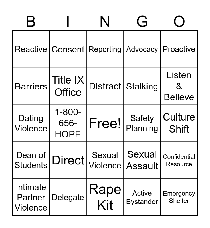 This bingo card has a free space and 24 words: Direct, Delegate, Distract, Intimate Partner Violence, Proactive, Reactive, Barriers, Consent, Safety Planning, Sexual Violence, Stalking, Dating Violence, Sexual Assault, Confidential Resource, Title IX Office, Active Bystander, Culture Shift, Reporting, Listen & Believe, 1-800-656-HOPE, Emergency Shelter, Dean of Students, Advocacy and Rape Kit.