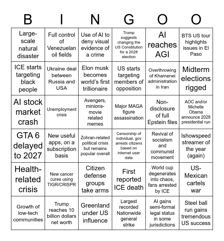 This bingo card has 36 words: First reported ICE death, Citizen defense groups take arms, Largest recorded Nationwide general strike, ICE starts targeting black people, GTA 6 delayed to 2027, Major MAGA figure assassination, Ukraine deal between Russia and USA, Greenland under US influence, AI reaches AGI, World cup degenerates into chaos, fans arrested by ICE, Midterm elections rigged, Trump suggests changing the US Constitution for a 2028 election, US-Mexican cartels war, Unemployment crisis, US starts targeting members of opposition, Large-scale natural disaster, Health-related crisis, Non-disclosure of full Epstein files, AI stock market crash, Use of AI to deny visual evidence of a crime, Avengers, minions-movie related memes, New useful apps, on a subscription basis, Censorship of individual, gov arrests citizens based on internet user data, Zohran-related political crisis but remains popular overall, Revival of socialism and communist movement, Full control of Venezuelan oil fields, Overthrowing of Khamenei administration in Iran, Trump reaches 10 billion dollars net worth, Elon musk becomes world’s first trillionaire, BTS US tour highlights issues in El Paso, Steel ball run gains tremendous US success, Growth of low-tech communities, Ishowspeed streamer of the year (again), AOC and/or Michelle Obama announce 2028 presidential run, New cancer cures using TIGR/CRISPR and AI gains semi-formal legal status in some jurisdictions.