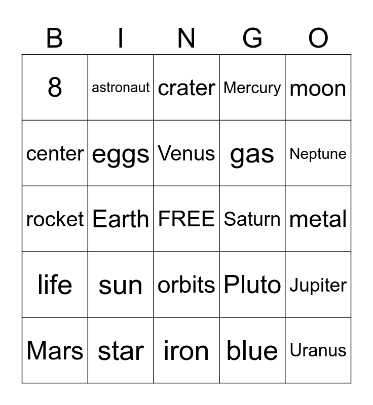 This bingo card has a free space and 24 words: sun, star, Venus, Mars, moon, 8, center, astronaut, Saturn, orbits, gas, rocket, Pluto, Jupiter, eggs, blue, metal, crater, Neptune, Earth, Uranus, life, Mercury and iron.