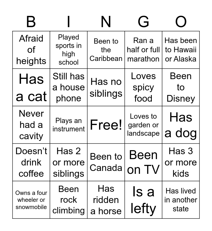 This bingo card has 38 words: Has never broken a bone, Drives less then 5 min to work, Read all the Harry Potter books, Still has a house phone, Has 3 or more kids, Has 2 or more siblings, Has no siblings, Married longer than 20 years (currently!), Has been to Hawaii or Alaska, Loves spicy food, Plays an instrument, Ran a half or full marathon, Free!, Has a dog, Has a cat, Doesn’t drink coffee, Been to Mexico, Been to the Caribbean, Been on a cruise, Loves to garden or landscape, Afraid of heights, Been rock climbing, Been to Disney, Owns a four wheeler or snowmobile, Has a tattoo, Has ridden a horse, Has lived in another state, Has had stitches, Never been on an airplane, Afraid of spiders, Dislikes Chocolate, Been to Canada, Is a lefty, Played sports in high school, Eaten an insect, Been on TV, Never had a cavity and Been skydiving or bungee jumping.