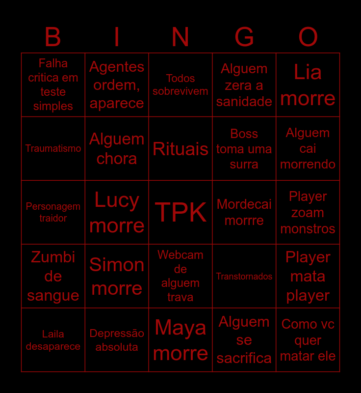 This bingo card has a free space and 24 words: Simon morre, Depressão absoluta, Rituais, Laila desaparece, Lia morre, Falha critica em teste simples, Traumatismo, Agentes ordem, aparece, Mordecai morrre, Webcam de alguem trava, Boss toma uma surra, Personagem traidor, Transtornados, Player mata player, Alguem chora, Alguem se sacrifica, Player zoam monstros, Todos sobrevivem, Alguem cai morrendo, Lucy morre, Como vc quer matar ele, Zumbi de sangue, Alguem zera a sanidade and Maya morre.