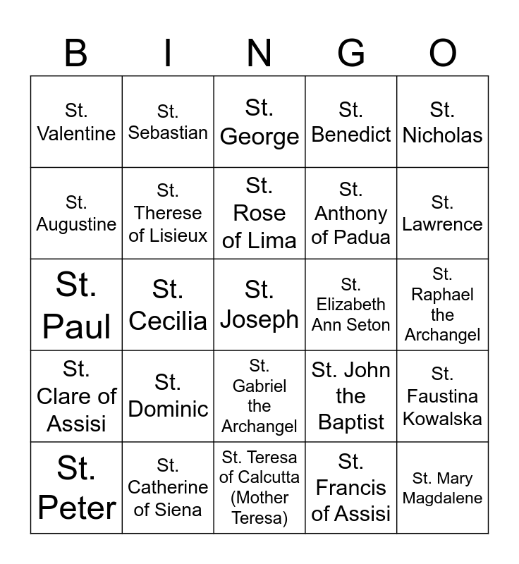 This bingo card has 36 words: Free!, St. John Bosco, St. Thomas Aquinas, St. Therese of Lisieux, St. John the Baptist, St. Clare of Assisi, St. Rose of Lima, St. Padre Pio, St. Nicholas, St. Ignatius of Loyola, St. Cecilia, St. Benedict, St. Michael the Archangel, St. Elizabeth Ann Seton, St. Lawrence, St. Valentine, St. Mary Magdalene, St. Dominic, St. Joseph, St. George, St. Raphael the Archangel, St. Faustina Kowalska, St. Catherine of Siena, St. Peter, St. Teresa of Calcutta (Mother Teresa), St. Sebastian, St. Paul, St. Joan of Arc, St. Anthony of Padua, St. Augustine, St. John Paul II, St. Patrick, St. Francis of Assisi, St. Gabriel the Archangel, St. Carlo Acutis and St. Giorgio Frassati.