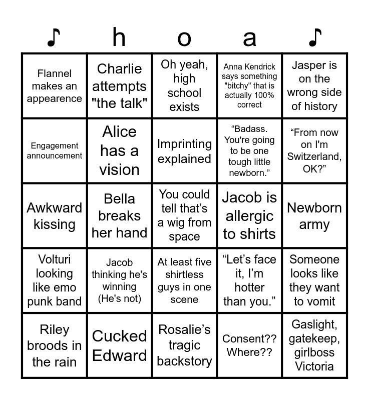 This bingo card has a free space and 24 words: Jacob thinking he's winning (He's not), Cucked Edward, Imprinting explained, Riley broods in the rain, Jasper is on the wrong side of history, Flannel makes an appearence, Engagement announcement, Charlie attempts "the talk", Jacob is allergic to shirts, At least five shirtless guys in one scene, “Badass. You're going to be one tough little newborn.”, Awkward kissing, “Let’s face it, I’m hotter than you.”, Someone looks like they want to vomit, Alice has a vision, Consent?? Where??, Newborn army, Oh yeah, high school exists, “From now on I'm Switzerland, OK?”, Bella breaks her hand, Gaslight, gatekeep, girlboss Victoria, Volturi looking like emo punk band, Anna Kendrick says something "bitchy" that is actually 100% correct and Rosalie’s tragic backstory.
